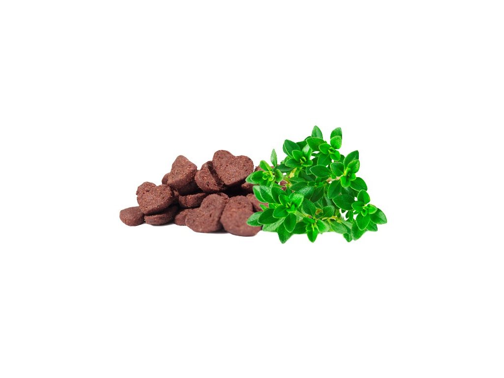 sušený losos, žlutý hrách, zelený hrách, hydrolyzovaný lososový protein, kuřecí tuk (konzervovaný tokoferoly), sušený tymián, sušené jablko, lněné semínko, hydrolyzovaná kuřecí játra.