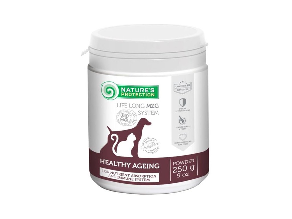 Speciálně vyvinutý doplněk stravy pro psy a kočky ve věku od 5 let podporuje imunitní a kardiovaskulární systém, zdraví kostí a zubů a celkovou pohodu a vitalitu. Přírodní minerál MicroZeoGen pomáhá odstraňovat toxiny, těžké kovy a viry z těla zvířete. Po detoxikaci je organismus připravený absorbovat antioxidanty, vitamíny a minerály. Uhličitan hořečnatý podporuje činnost svalů a nervů a uhličitan vápenatý je důležitý pro zdraví kostí a pevnost zubů. Vysoký obsah hrubého popela ukazuje na kvalitu a obsah minerálů, jako jsou vápník a fosfor, které jsou důležité pro zdraví kostí.