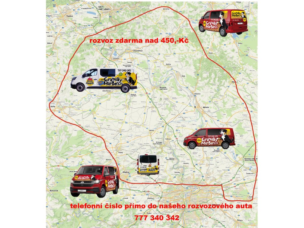 Rozvážíme zdarma vlastní dopravou v těchto lokalitách, nespoléháme se na kurýrní služby, vše si vozíme sami. Nemáme váhový limit a Taste Puppy dovezeme během