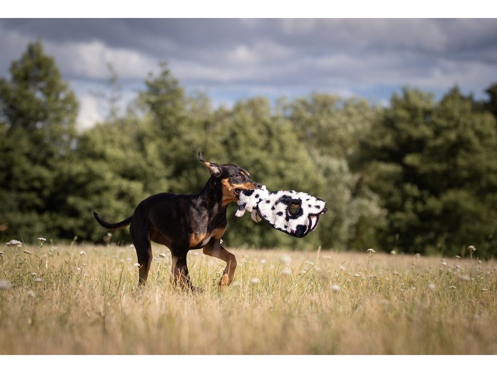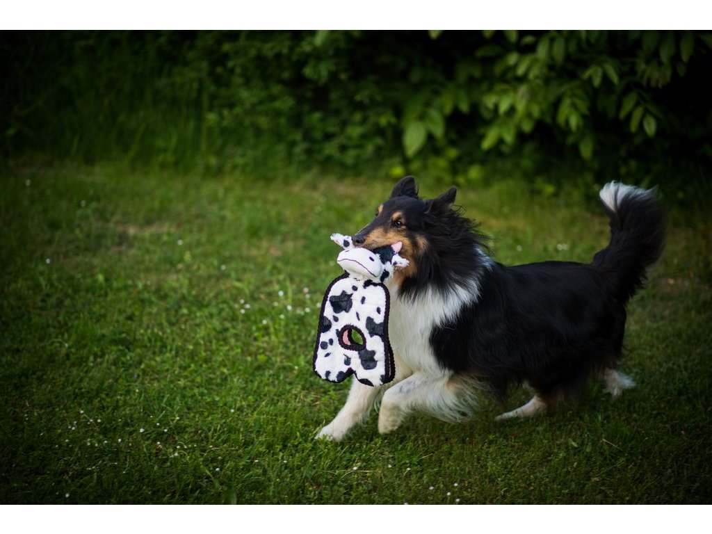 Díky otvoru uprostřed se hračka snadno uchopí a umožňuje pohodlné a bezpečné přetahování mezi psem a jeho majitelem. Uvnitř se nachází několik pískátek a zadní část hračky navíc šustí, což ještě víc podporuje zájem a hravost psa.