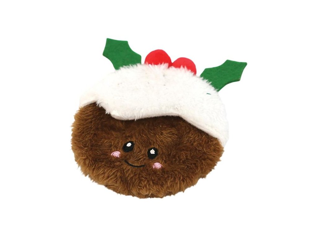 Roztomilá hračka pro psy – vánoční puding z hebkého plyše – vybízí svým zploštělým tvarem k aportování a nošení v tlamě. Je bez výplně, takže v případě roztržení nezpůsobí nepořádek. Pro větší zábavu hračka šustí.
