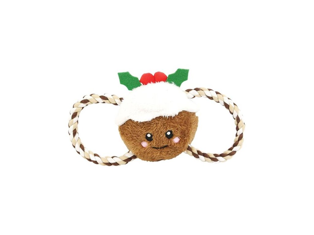 Roztomilá hračka pro psy – vánoční puding z hebkého plyše s provazovými úchyty – přímo vybízí k přetahování a nošení v tlamě.
