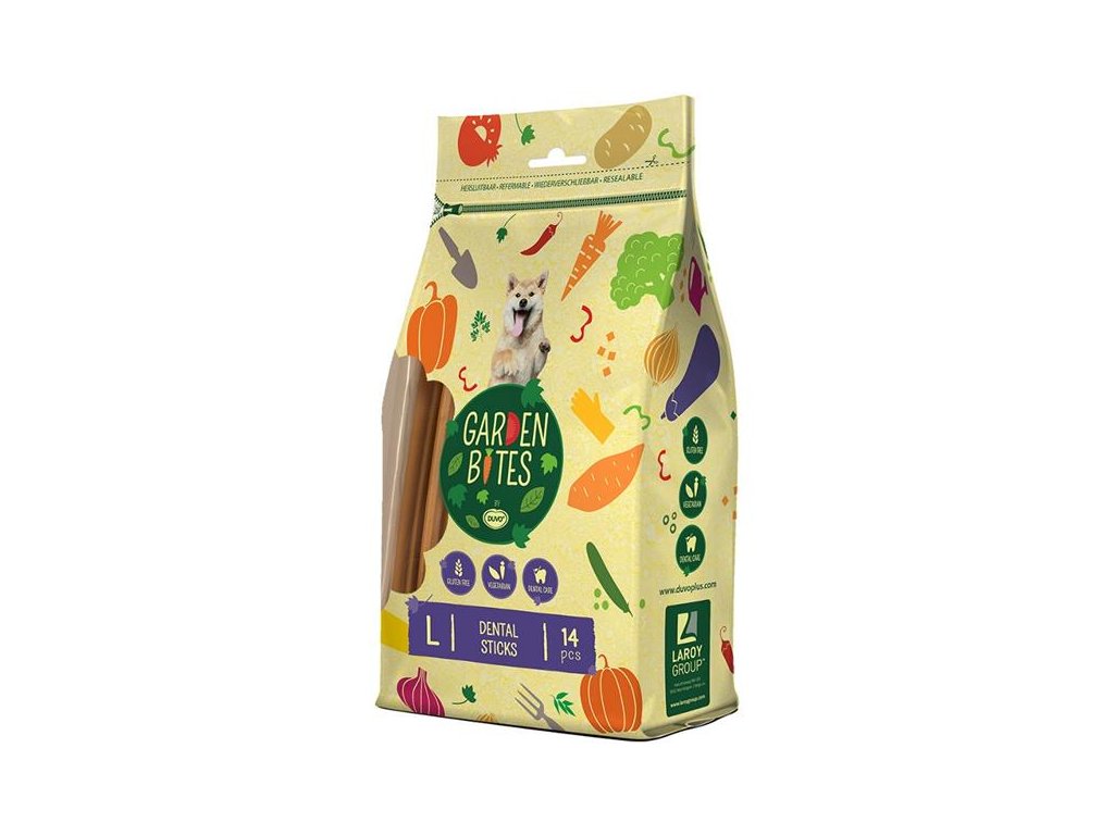 Vegetariánská pochoutka Garden Bites je ideální odměnou pro Vašeho psa. Výborný pamlsek pro psy trpící na alergie, protože tato pochoutka je 100% bez lepku a lehce stravitelná. Díky speciálním tvarům napomáhá pamlsek při čištění a masírování zubů. Přírodní extrakt oleje z máty pak zajišťuje čerstvý dech. Garden Bites obsahuje nejméně 55% sladkých brambor, které jsou skvělým doplňkem stravy Vašeho psa. Sladké brambory jsou bohaté na vápník a železo.