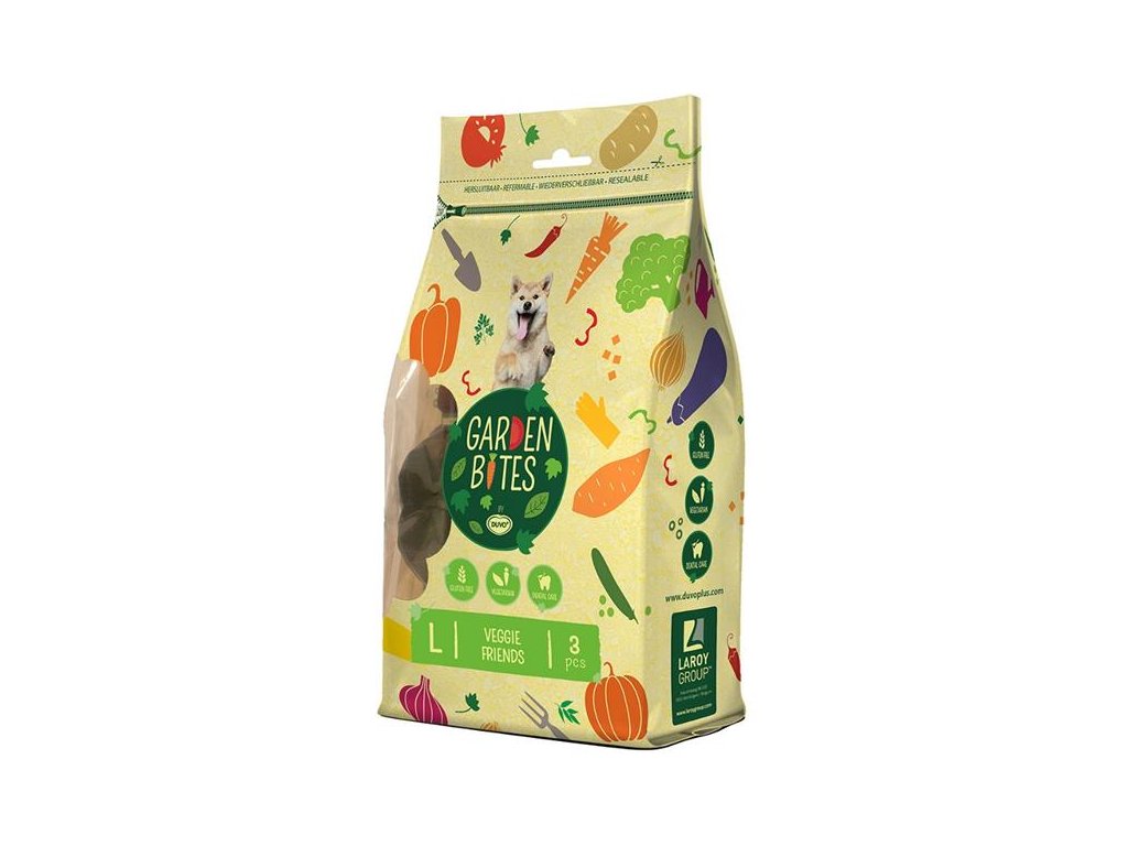 Vegetariánská pochoutka Garden Bites je ideální odměnou pro Vašeho psa. Výborný pamlsek pro psy trpící na alergie, protože tato pochoutka je 100% bez lepku a lehce stravitelná. Díky speciálním tvarům napomáhá pamlsek při čištění a masírování zubů. Přírodní extrakt oleje z máty pak zajišťuje čerstvý dech. Garden Bites obsahuje nejméně 55% sladkých brambor, které jsou skvělým doplňkem stravy Vašeho psa. Sladké brambory jsou bohaté na vápník a železo.