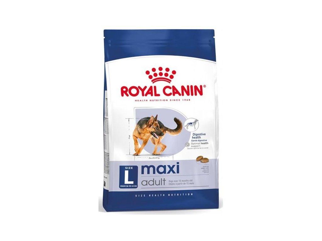 ROYAL CANIN® Maxi Adult je nutričně kompletní a vyvážená receptura navržená tak, aby splňovala specifické potřeby velkých psů (26–44 kg) po celou dobu jejich dospělosti od 15 měsíců do 5 let. Větší psi jsou z důvodu delšího trávicího traktu ve srovnání s menšími plemeny náchylnější k zažívacím potížím. Granule proto obsahují vyvážený poměr vysoce stravitelné bílkoviny a vlákniny, který prospívá trávicímu traktu. Větší psi také více zatěžují kloubní aparát. Receptura proto obsahuje kombinací minerálů a živin, které podporují zdraví kostí a kloubů. Směs vitamínů a vysoce kvalitních živin s maximální vstřebatelností podporuje celkovou kondici. Tvar a velikost granulí jsou uzpůsobené tak, aby psa povzbudily k důkladnému žvýkání potravy.