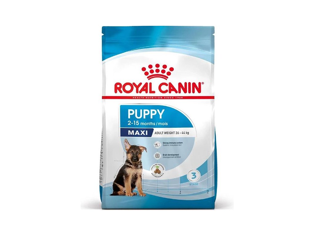 ROYAL CANIN® Maxi Puppy je krmivo vyvinuté speciálně pro štěňata velkých plemen psů (o hmotnosti 26–44 kg v dospělosti) ve věku 2–15 měsíců. Optimální obsah kalorií uspokojuje energetické potřeby rostoucích štěňat. Receptura obsahuje živiny a vitamíny C a E, které prokazatelně pomáhají podporovat imunitní systém. Krmivo je obohaceno o omega-3 mastné kyseliny, u kterých bylo vědecky prokázáno, že napomáhají ke zdravému vývoji mozku štěňat. Prospěšná prebiotika (FOS, MOS a řepné řízky) a vysoce stravitelné proteiny podporují rovnováhu střevního mikrobiomu (zdravou střevní mikroflóru) pro dobré trávení. Velikost a tvar granulí pomáhají regulovat rychlost jejich konzumace a podporují sytost. Suché granule podporují přirozené mechanické čištění zubů, což omezuje tvorbu zubního kamene.