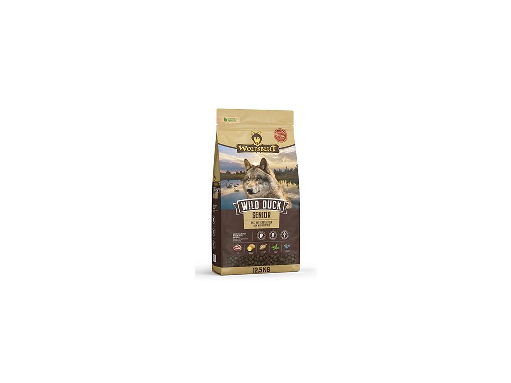 Vlci loví svou kořist od Skalistých hor Severní Ameriky, arktické tundry, hor a lesů Evropy až po pouště a stepi Střední Asie. Ty jim z obsahu žaludku kořisti poskytují maso a na živiny bohaté vnitřnosti, stejně jako zeleninu, ovoce, bobule, kořeny a bylinky. Obiloviny nejsou zahrnuty. Takto vlk získává vitamíny, minerály, stopové prvky, enzymy a druhotné rostlinné látky, které potřebuje. Protože vlk je předkem všech psů, je naše suché krmivo pro psy Wolfsblut založeno na přirozených stravovacích návycích vlka. Obsahuje dostatek masa nebo ryb v kombinaci se superpotravinami s cennými ingrediencemi – stejně jako v přírodě, bez obilovin. Náš výběr výjimečného masa a superpotravin bohatých na živiny je založen na vlčím prostředí a jeho rozmanité stravě. WOLFSBLUT nabízí každému psovi druhově vhodnou a přirozenou stravu a díky své rozmanitosti si každý pes najde to své. Receptura suchého krmiva WILD DUCK SENIOR kombinuje stravu vlka s nejnovějšími vědeckými poznatky o správné výživě psů.