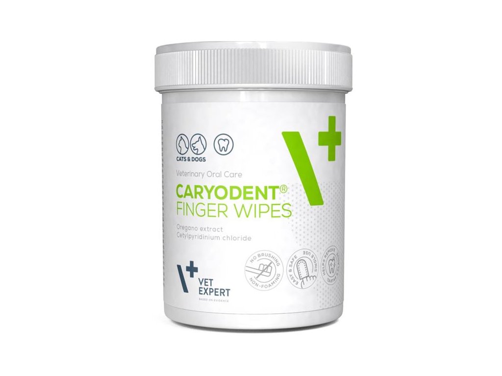 Praktické návleky na prst umožňují snadnější a účinnější čištění zubů psů a koček. Ubrousky Caryodent jsou namočené v roztoku cetylpyridiniumchloridu, který optimalizuje ústní mikrobiom, a v oreganovém oleji, který je vynikajícím zdrojem β-karyofylenu, látky podporující optimální stav ústní sliznice a dásní.